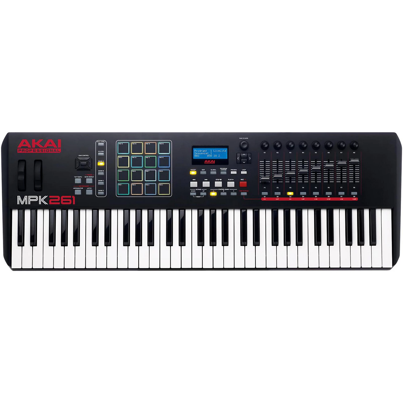 The Akai Professional MPK261 is a performance pad and keyboard controller that combines deep software integration, enhanced workflow and core technologies from the iconic line of MPC workstations. Each member of Akai Professional’s MPK series comes fully loaded with a comprehensive interface for manipulating virtual instruments, effect plug-ins, DAWs and more. MPK261 features 61 semi-weighted keys with aftertouch, 8 assignable knobs, faders and switches, 16 MPC-style pads with RGB feedback and onboard transport buttons. Three banks expand the number of knobs, faders and switches (up to 24 each), and four pad banks expand the number of pads (up to 64 total). Plus, MPK261 is optimized to interface directly with your Mac or PC with USB power and plug-and-play connectivity.Made To PlayMPK261 comes equipped with 61 semi-weighted, full-size keys and a premium piano-style keybed for unprecedented response and natural feel. Each key is velocity-sensitive and outfitted with aftertouch for dynamic, expressive performances and recordings. In addition, onboard Octave Up and Down controls allow players to access the entire melodic range. Bundled with MPK261 is SONiVOX’s Eighty Eight Ensemble, an authentic grand-piano virtual instrument, that lets you compose or perform with pristine, expertly voiced piano samples.Genuine MPC FunctionalityClassic MPC Swing, MPC Note Repeat, MPC Full Level and 16 Levels are all onboard for further inspiration. With MPK261, musicians and composers can incorporate genuine MPC workflow into their productions and create with the tools that producers have relied on for years: MPC Swing lets MPK261 users obtain that tight, organic groove that made Akai Professional’s groundbreaking MPC music-making machines so legendary. MPC Note Repeat and 16 Levels make it easy to build beats and construct short melodic sequences using the MPC-style pads. In addition, an arpeggiator, with adjustable resolution, range and patterns, enables users to explore complex melodic ideas, effortlessly.Production SoftwareMPK261 is armed with powerful production software-Ableton Live Lite and MPC Essentials-for out-of-the-box music creation. Ableton Live Lite is a fluid audio/MIDI environment that enables musicians and producers to spontaneously compose, record, remix, improvise and edit musical ideas. MPC Essentials, a groove/beat production and sample-triggering software, can integrate directly into any DAW, such as Ableton Live Lite, or run standalone. In addition, it extends the power of MPK261 by adding up to 8 pad banks, and 4 samples and insert effects per pad.Virtual InstrumentsA world-class piano instrument and two high-definition virtual synthesizers bring the best of sample-based and synthesis technology to MPK261 users. SONiVOX Eighty Eight Ensemble is a recreation of the Steinway 9-foot CD 327 grand piano layered with additional orchestral and synthetic instruments for rich, cinematic sounds. Hybrid 3, by AIR Music Tech, is a versatile virtual synthesizer that combines the warmth of legendary analog synths with a full range of futuristic, digital manipulation capabilities. SONiVOX Twist, a spectral morphing synthesis virtual instrument, makes it easy to create serious sounds using simple controls.